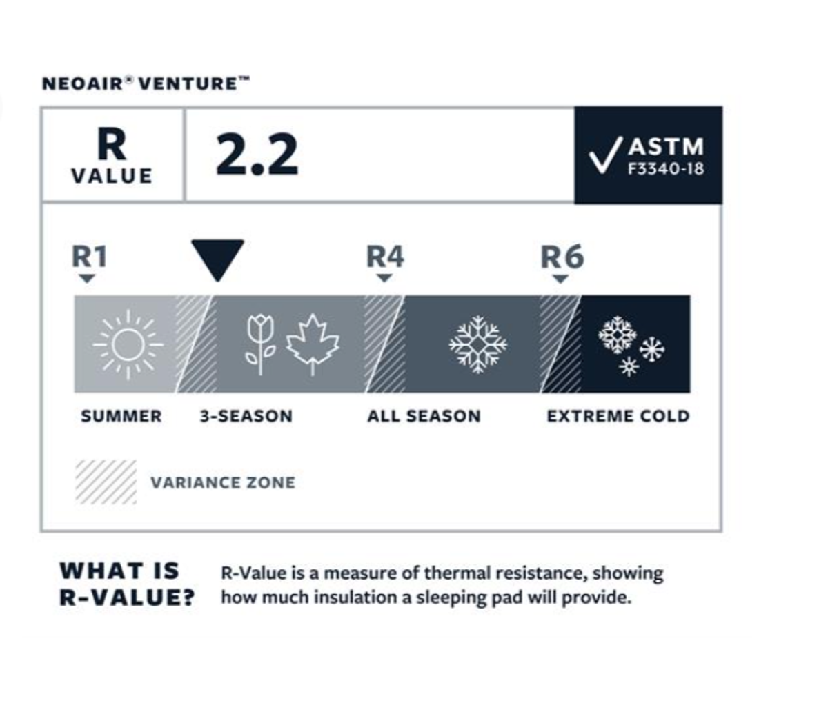 Venture har R-verdi på 2.2. Liggeunderlaget kan derfor brukes senvår, sommer og tidlig høst. R-verdien til Therm-a-Rest er bygget på ASTM-standarden som kom i 2020. Denne standarden er utviklet av blant andre Therm-a-Rest og er den første universale standarden for R-verdi.
